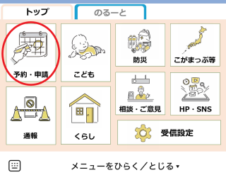 3.「メニューをひらく」を押して、「予約・申込」を押す